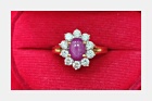 แหวนทองเจือหน้าเงิน 1 วง เกาะเพชรลูก 10 เม็ด พลอยแดง บุบชำรุด น้ำหนัก 3.2 กรัม |