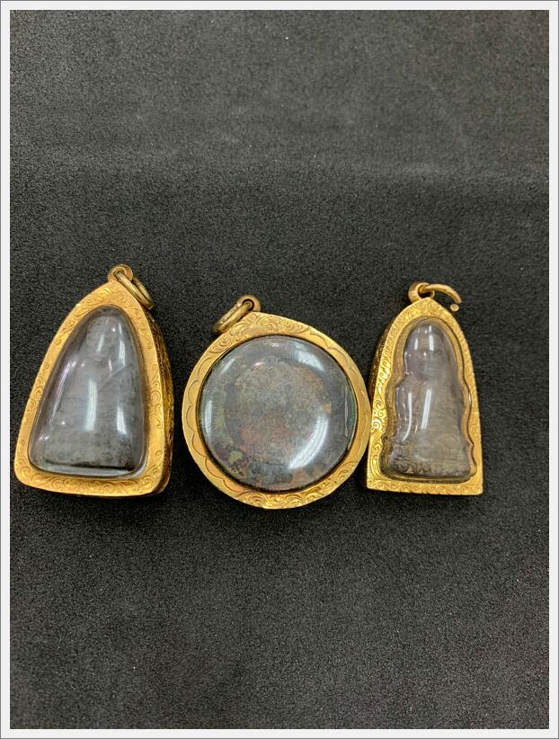| พระเลี่ยมทองเจือสลักลาย 2 องค์ เหรียญร.9เลี่ยมทองเจือสลักลาย 1 องค์ บุบชำรุด น้ำหนัก 52.7 กรัม |