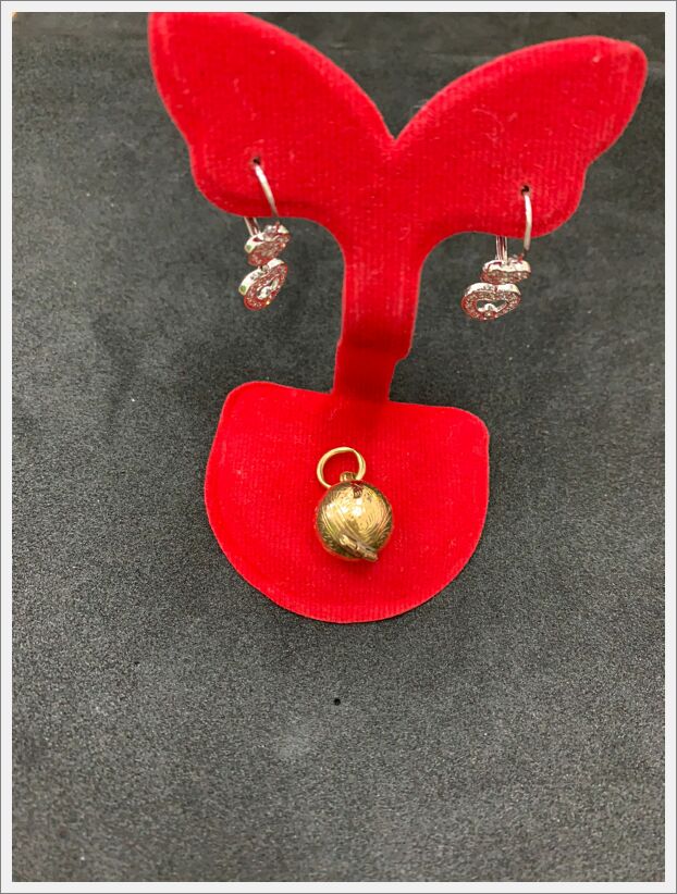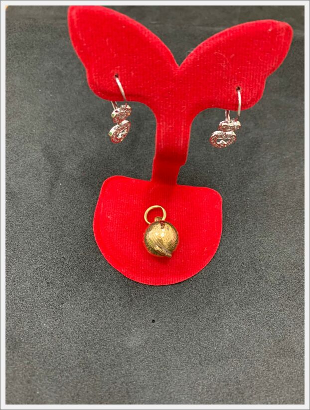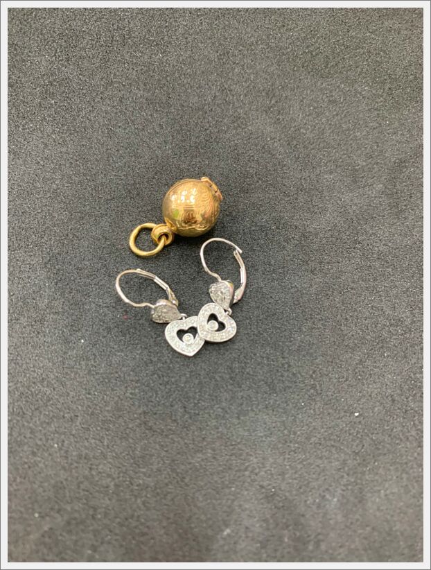 | ต่างหูขอเกี่ยวระย้าหัวใจทองเคชุบเงิน 1 คู่เกาะเพชรลูก 44 เม็ด ล็อกเกตลูกโลกทองเจือ 1 อัน บุบชำรุด น้ำหนัก 3.5 กรัม |