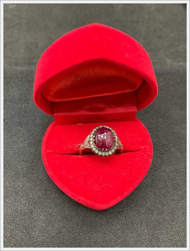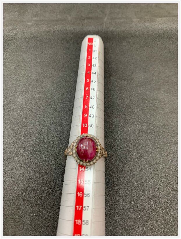 แหวนทองเจือหน้าเงินประดับพลอยขาว-แดง 1 วงพลอยแตก บิ่น บุบชำรุด น้ำหนัก 4 กรัม |