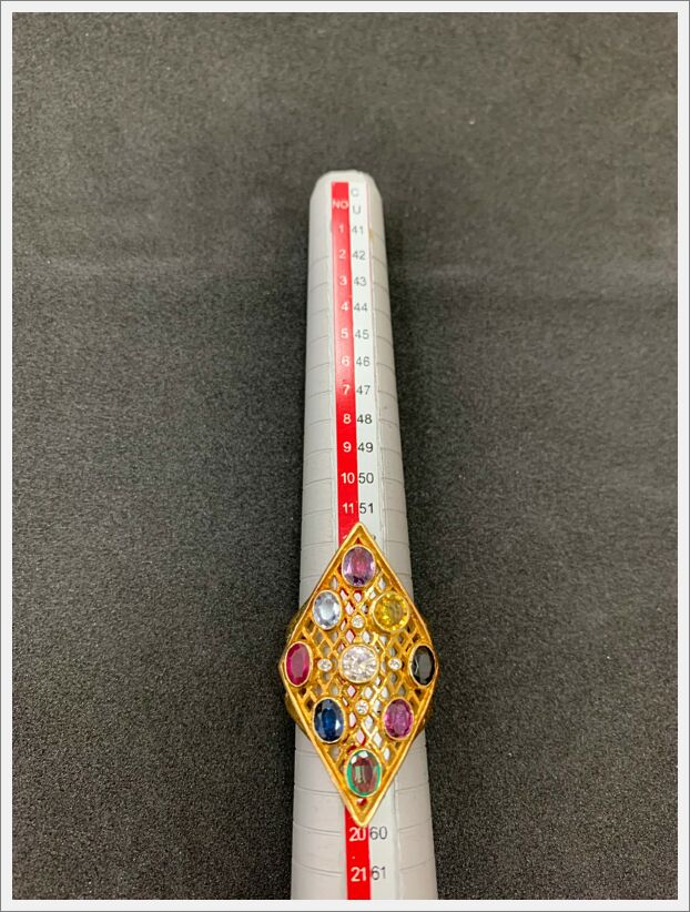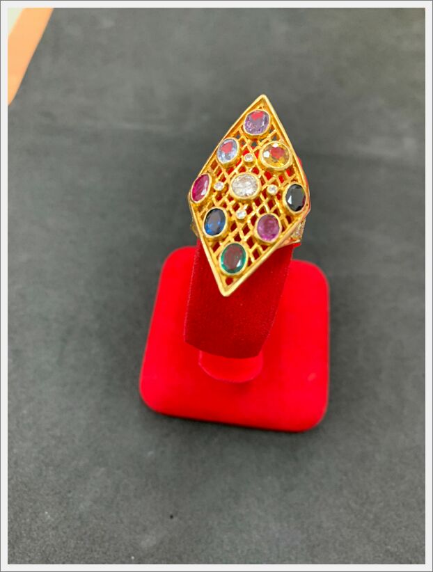 | แหวนทองเจือหน้าเงินฉลุลาย 1 วงเกาะเพชรลูก 19 เม็ดประดับพลอยสีต่างๆ ชำรุด น้ำหนัก 11.7 กรัม |