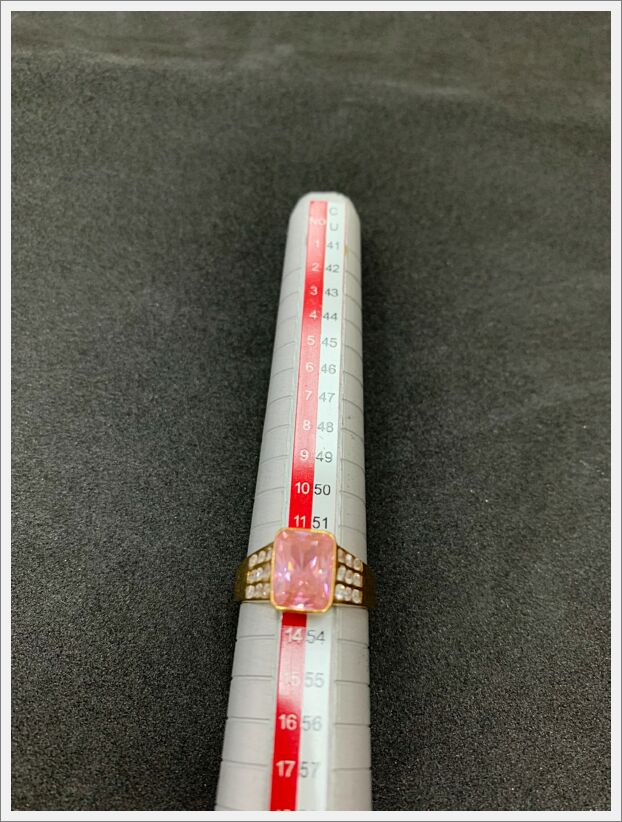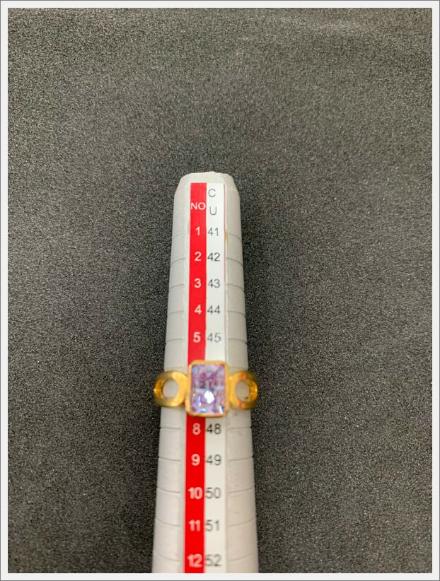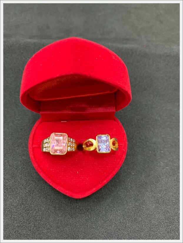 แหวนทองเจือฉลุลายฝังพลอยม่วง 1 วง แหวนทองเจือประดับพลอยขาว-ชมพู 1 วง บุบชำรุด น้ำหนัก 9.1 กรัม |