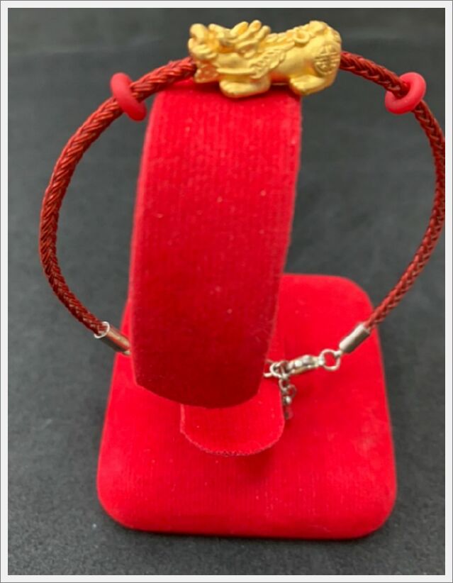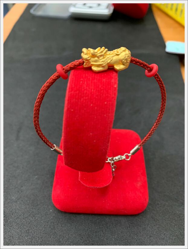 สร้อยมือเชือกร้อยปี่เซี้ยะทองเจือ 1 สาย น้ำหนักรวมเชือก บุบชำรุด น้ำหนัก 3.4 กรัม |