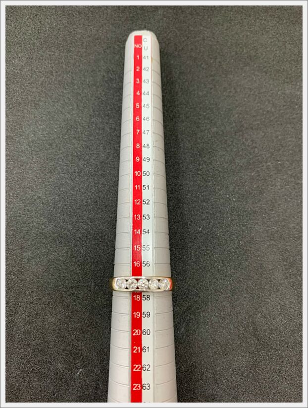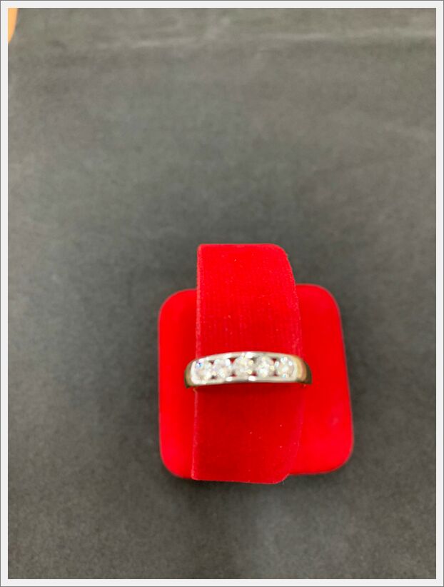 แหวนทองเจือหน้าเงิน 1 วงฝังเพชรลูก 5 เม็ด บุบชำรุด น้ำหนัก 3.7 กรัม